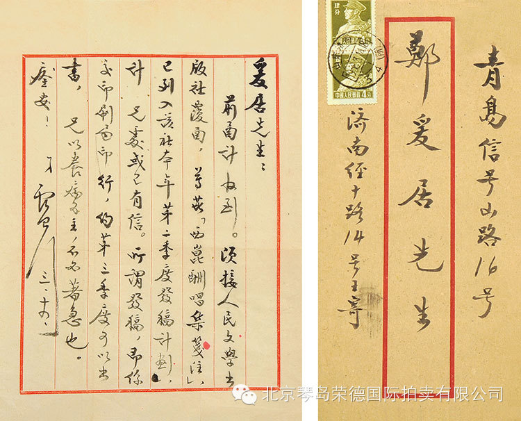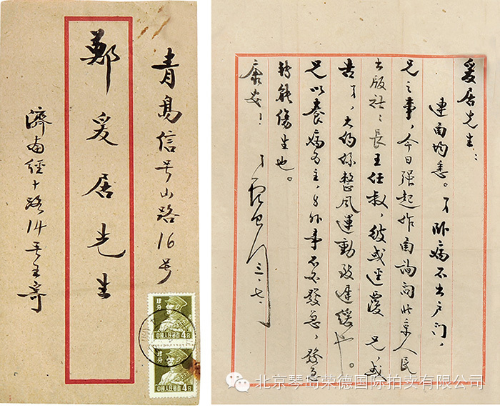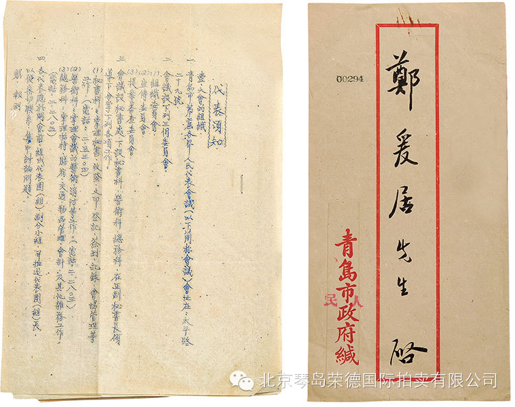 6、青岛政府致郑爰居信札一通,(附信封)。(青岛市市长彭畏三墨迹印章)(青岛市委书记王卓青墨迹印章)