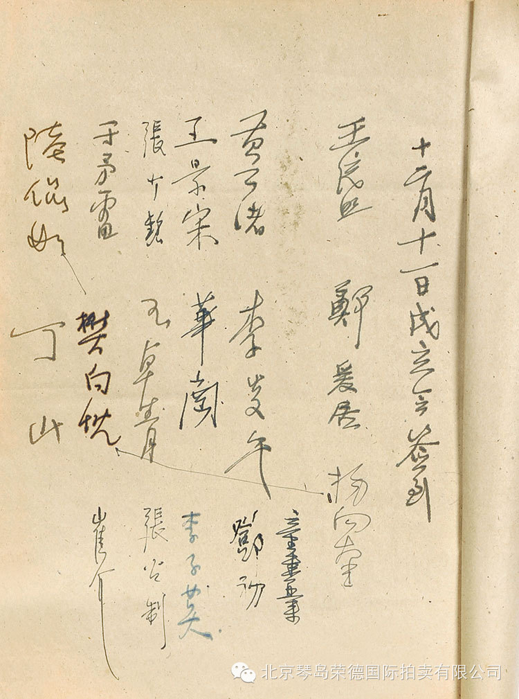 1725 1949年青岛古物管理委员会第一次会议,18人签名册、王统照、郑爰居、陆侃如、黄孝緖、杨向奎、张公制、催介、华岗、王景宋、王卓青、丁山等。主席:郑爰居 记录:张少铭 墨迹十页 RMB:无底价