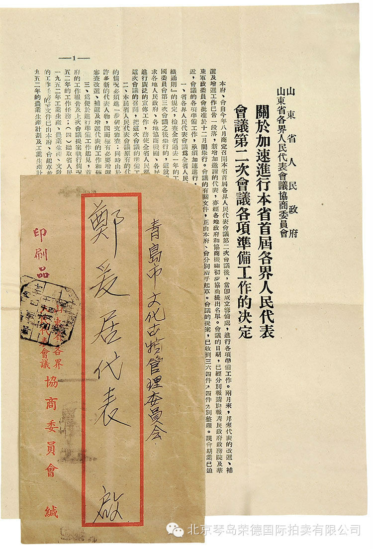 4、青岛各界人民代表会议常务委员会致郑爰居先生信札一通,(附信封)
