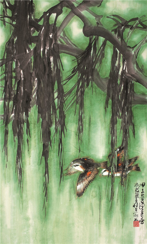 chen peiqiu(b.1922) Two Birds under the shade of willow tree