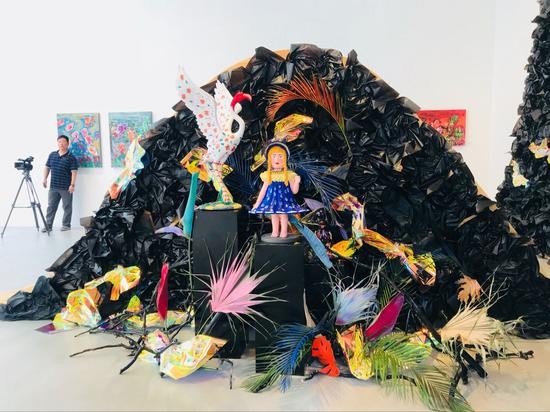 在展览策划上,她花费了很多的心思,比如专门制作了装置作品:“这次展览还专门展示了她的装置作品,为了与空间更加契合,我们采用了黑色的背景,再配合艺术家充满童真的小雕塑,尽量呈现出艺术家童真的世界。”