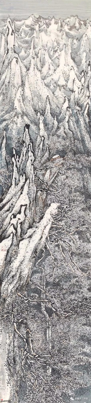 我们细心打量道平先生几十年来开垦的艺术园地,他营造空山幽谷、林泉飞壑,皆为精神家园、心灵驿站。富有弹性的长线贯穿画面,张力十足;灵动多变的墨点漫山遍野,有如大珠小珠,皆入玉盘,结构山石树木,融汇画面。这些层层叠叠、无以计数的点线已然成为朱氏皴法,丰富和发展了传统国画技法。
