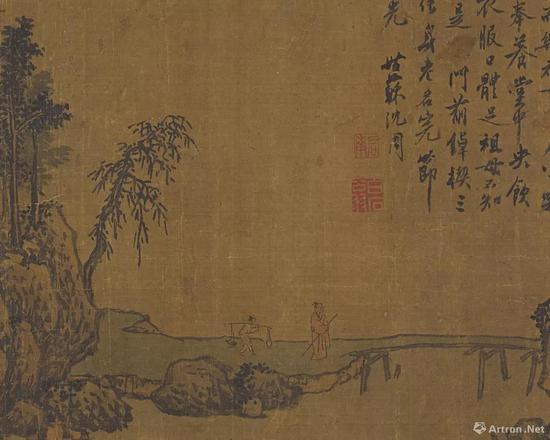 左侧则写文士与书僮策杖渡桥,僮肩担牲酒,似前去祝寿,人物、树石皆富沈周个人特色。