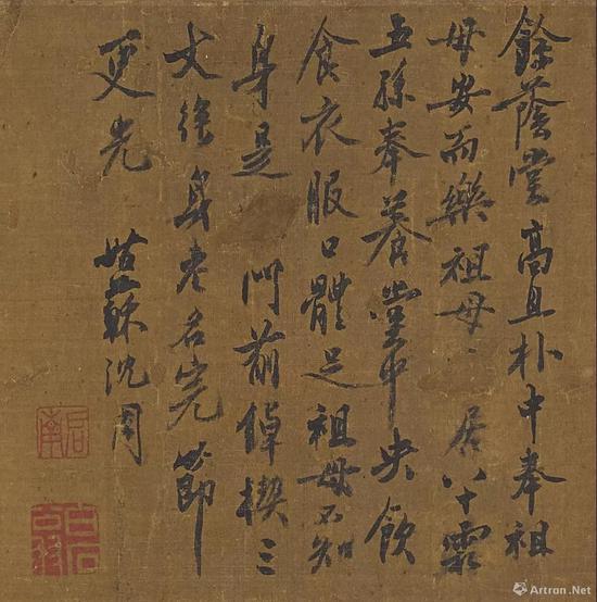 沈周与其妻极尽孝道,“事祖母甚勤,奉母甚孝”,并终身秉持“父母在,不远游”之儒道,不委身入仕。本幅或绘与子孙,以孝传家。